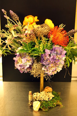 How often do you get to do flowers for a great painter's birthday? Well, since the Blanton was throwing Monet a party, I got to do the flowers! Vintage containers filled with lavender, pincushions, hydrangea, ranunculus, anemones, pieris and moss. It wouldn't be complete without snail shells and vintage artist's pigment vials.